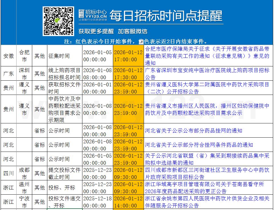 今日政策汇总与招标时间点提醒1月10日-1月12日