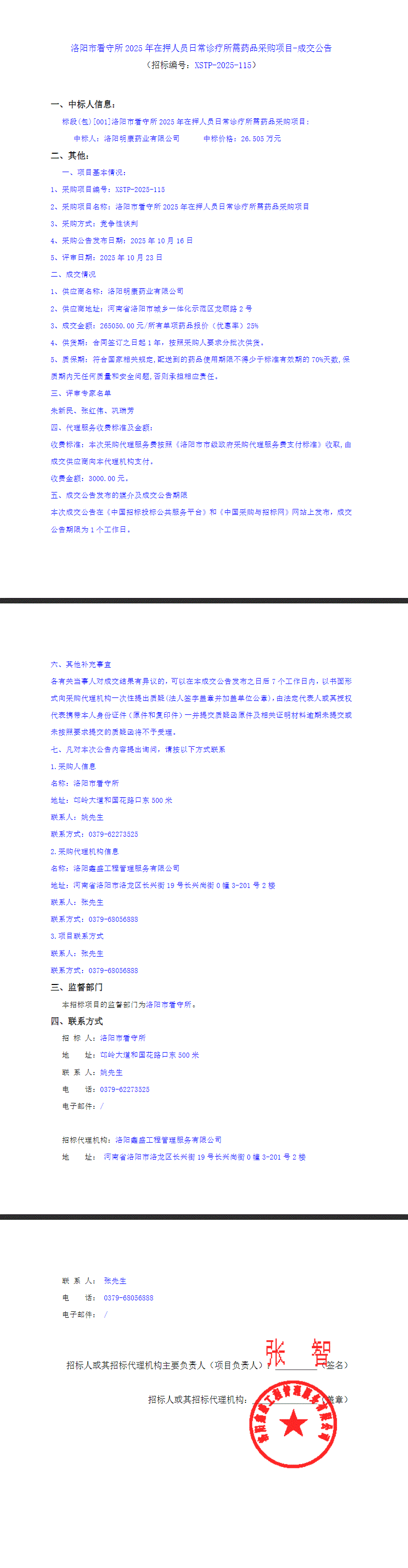 河南省洛阳市看守所2025年在押人员日常诊疗所需药品采购项目-成交公告