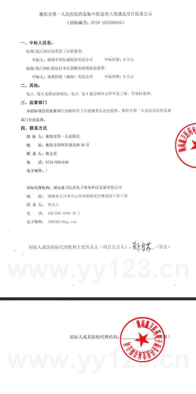 湖南省衡阳市第一人民医院药品集中配送商入围遴选项目结果公示