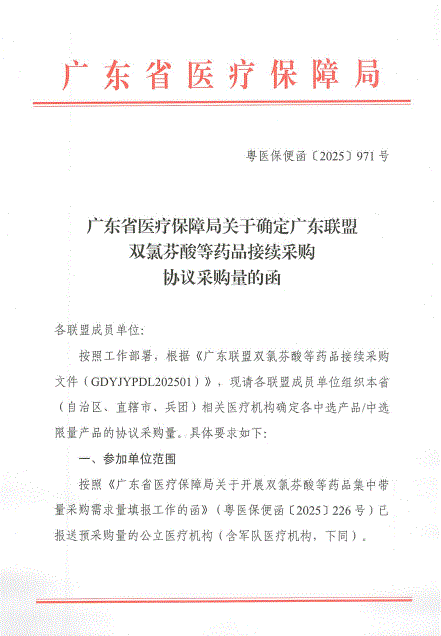 广东省医疗保障局关于确定广东联盟双氯芬酸等药品接续采购协议采购量的函(非官方)