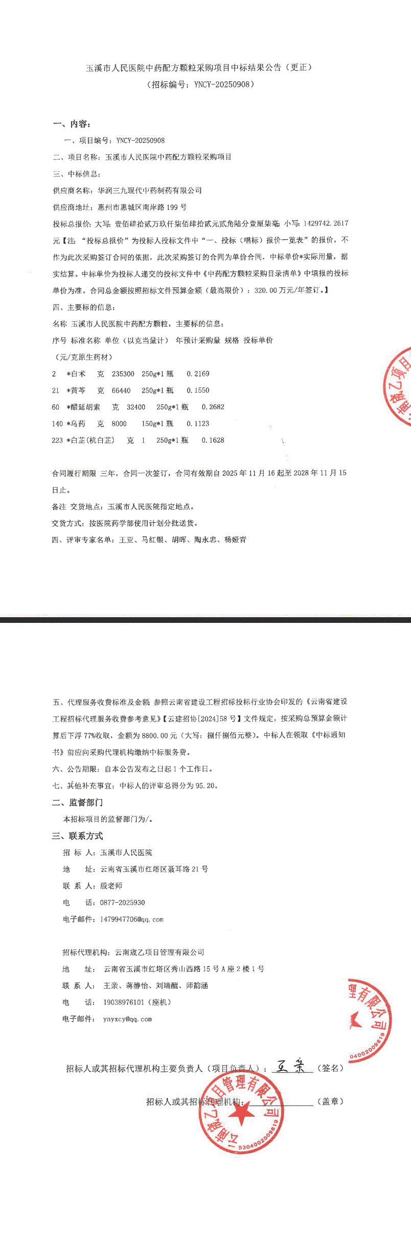 云南省玉溪市人民医院中药配方颗粒采购项目中标结果公告(更正)