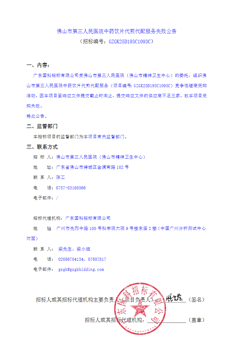 广东省佛山市第三人民医院中药饮片代煎代配服务失败公告