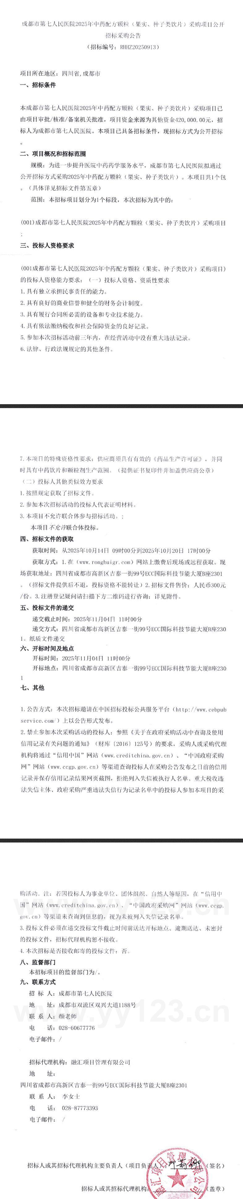 四川省成都市第七人民医院2025年中药配方颗粒(果实、种子类饮片)采购项目公开招标采购公告