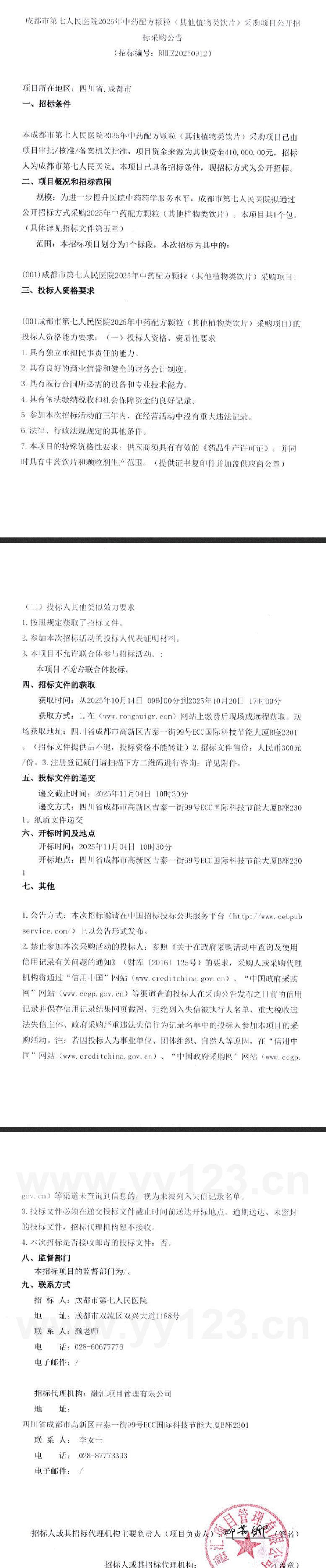 四川省成都市第七人民医院2025年中药配方颗粒(其他植物类饮片)采购项目公开招标采购公告