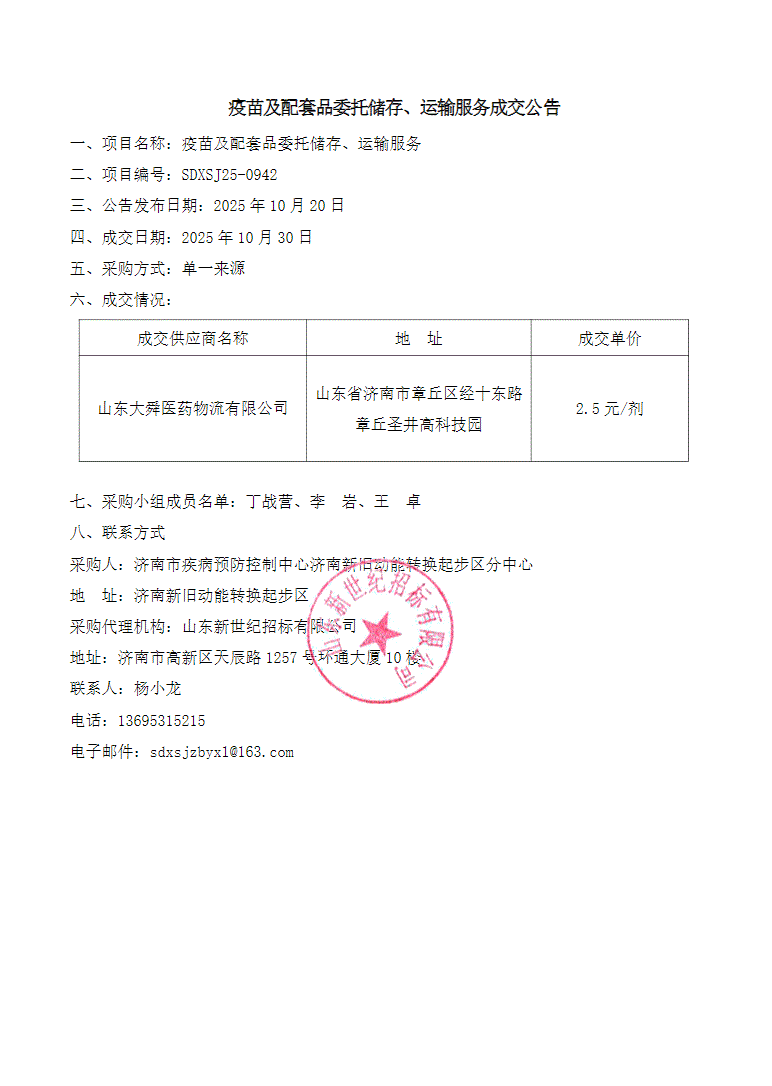 山东省济南市疾病预防控制中心济南新旧动能转换起步区分中心疫苗及配套品委托储存、运输服务成交公告更正公示