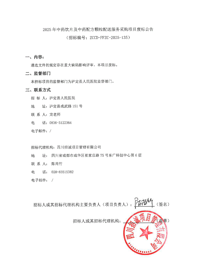 四川省甘孜藏族自治州泸定县人民医院2025年中药饮片及中药配方颗粒配送服务采购项目废标公告