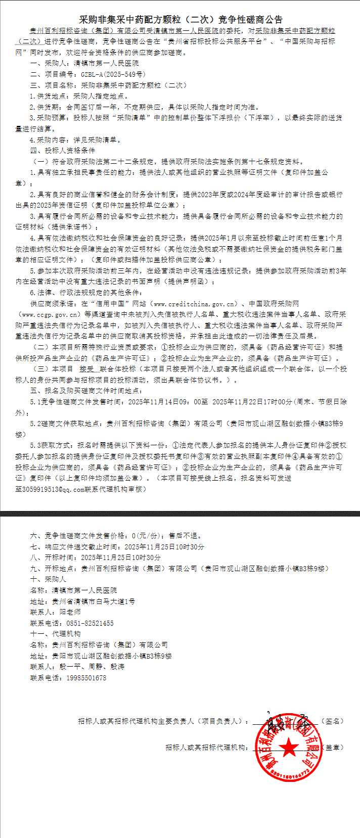 贵州省清镇市第一人民医院采购非集采中药配方颗粒(二次)竞争性磋商公告