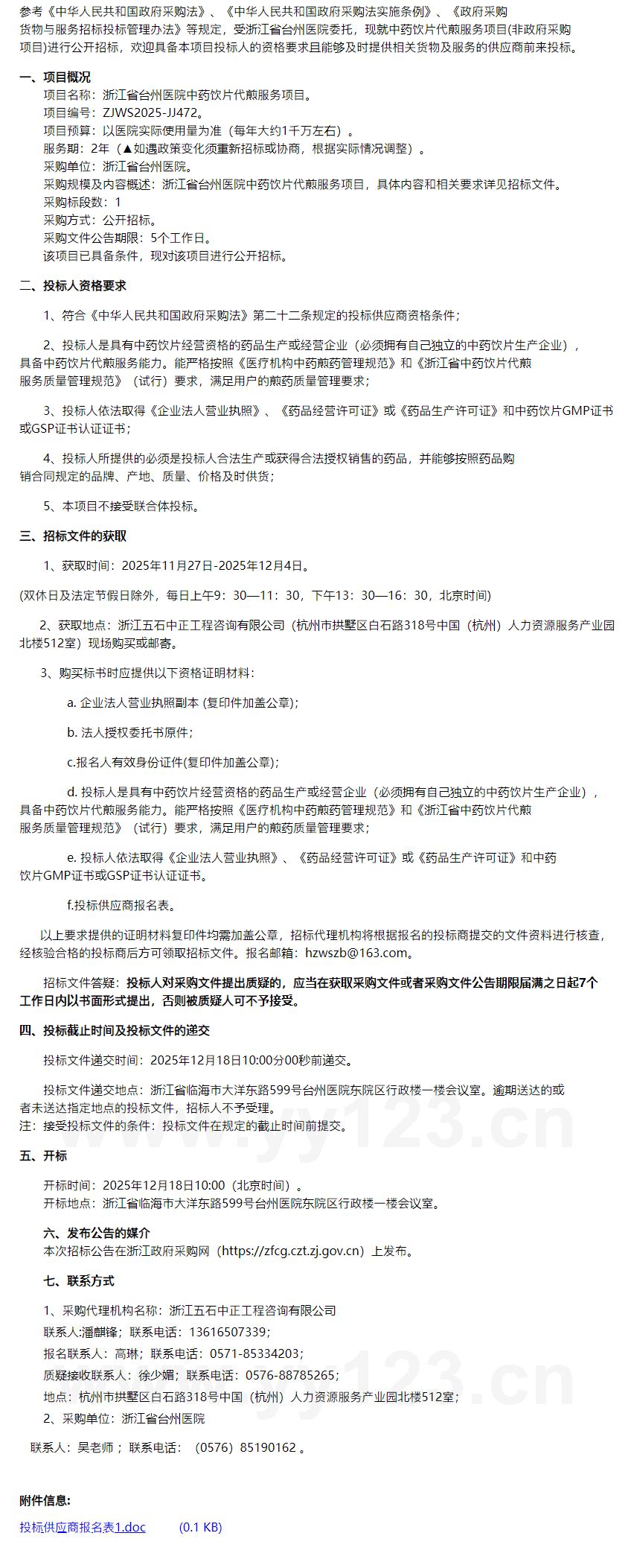 浙江五石中正工程咨询有限公司关于浙江省台州医院中药饮片代煎服务项目的公开招标公告