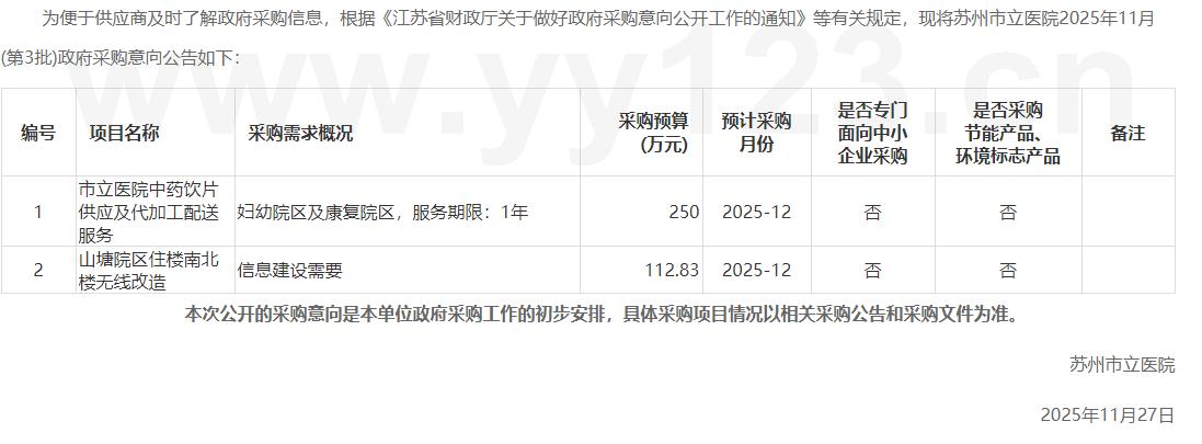 江苏省苏州市立医院2025年11月(第3批)政府采购意向公告