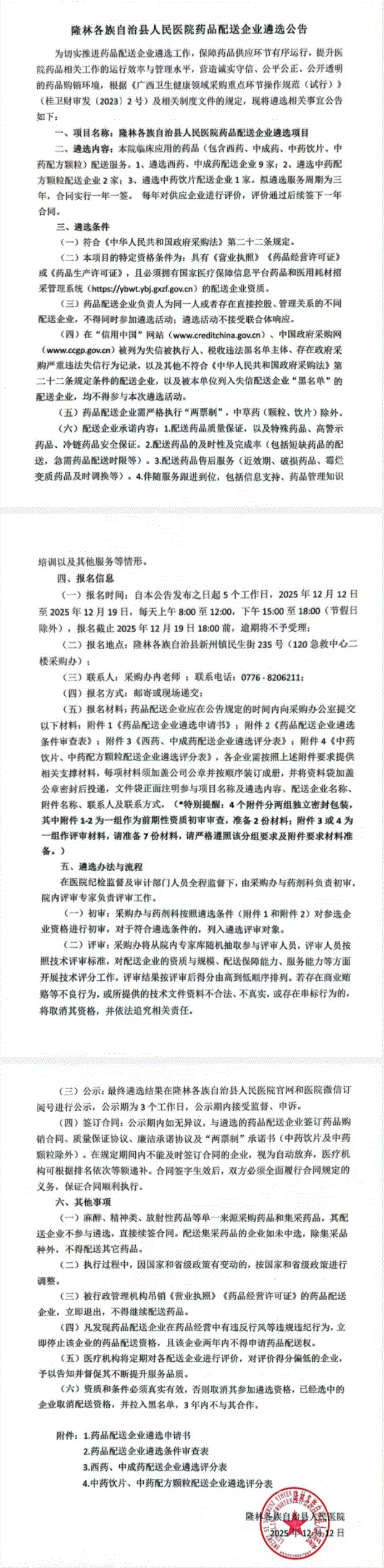 广西壮族自治区百色市隆林各族自治县人民医院药品配送企业遴选公告