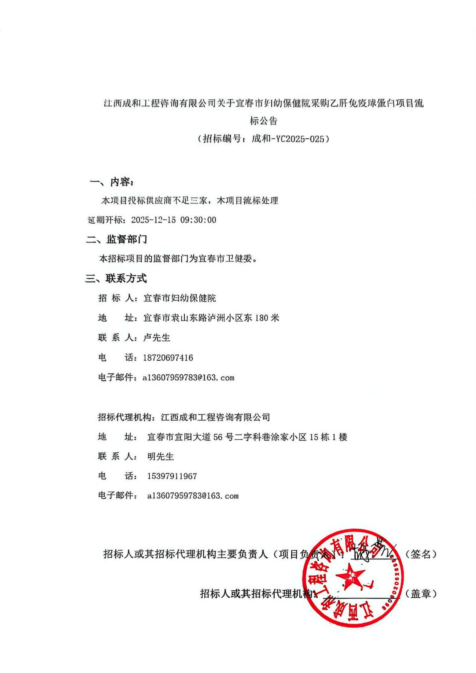 江西成和工程咨询有限公司关于宜春市妇幼保健院采购乙肝免疫球蛋白项目流标公告