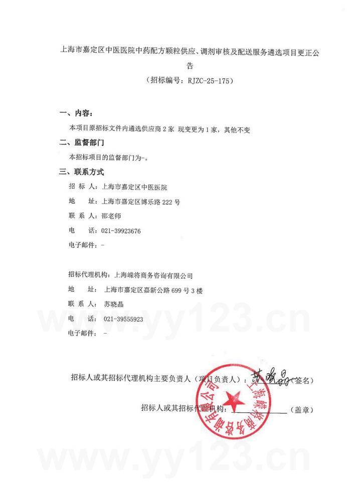 上海市嘉定区中医医院中药配方颗粒供应、调剂审核及配送服务遴选项目更正公告