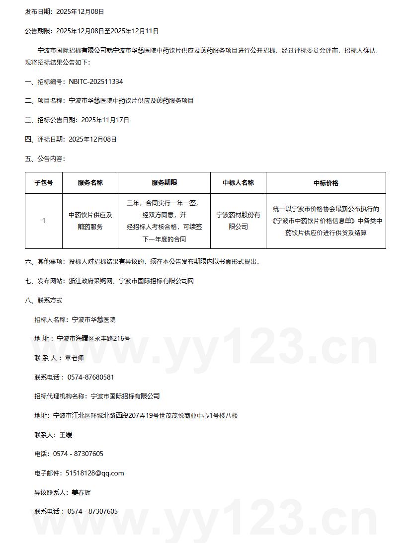 浙江省宁波市华慈医院中药饮片供应及煎药服务项目结果公告