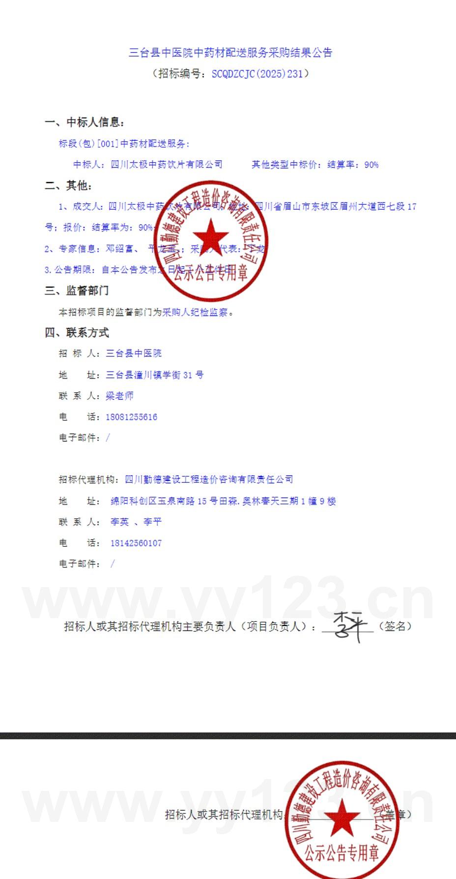 四川省绵阳市三台县中医院中药材配送服务采购结果公告
