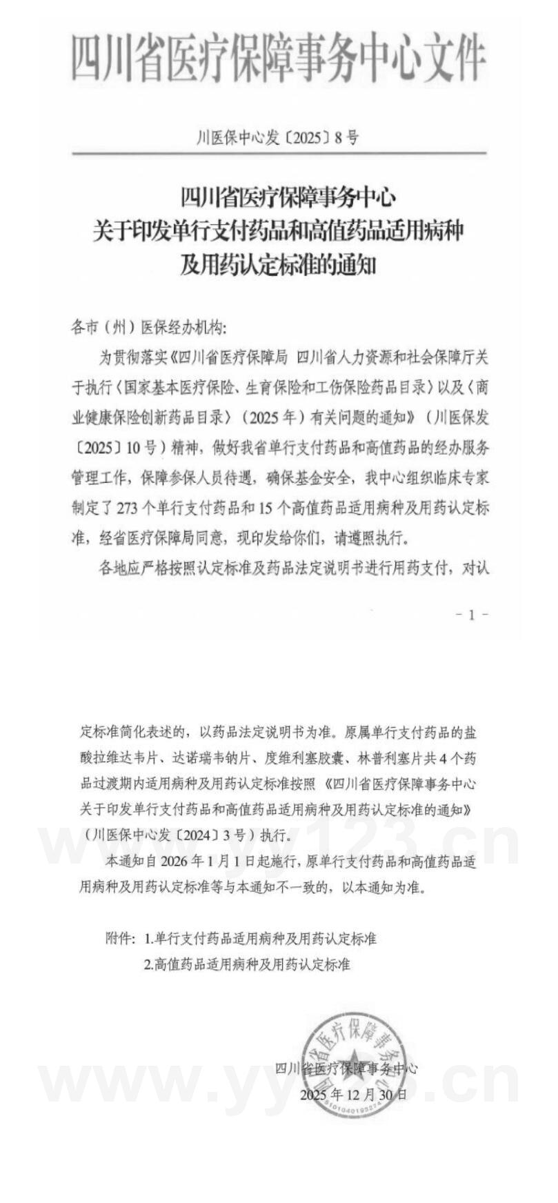 附件:四川省医疗保障事务中心关于印发单行支付药品和高值药品适用病种及用药认定标准的通知(川医保中心发〔2025〕8号)
