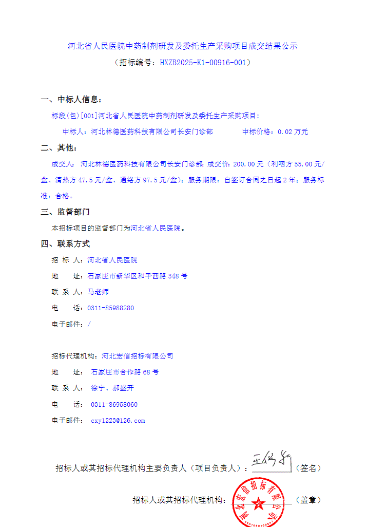 河北省人民医院中药制剂研发及委托生产采购项目成交结果公示