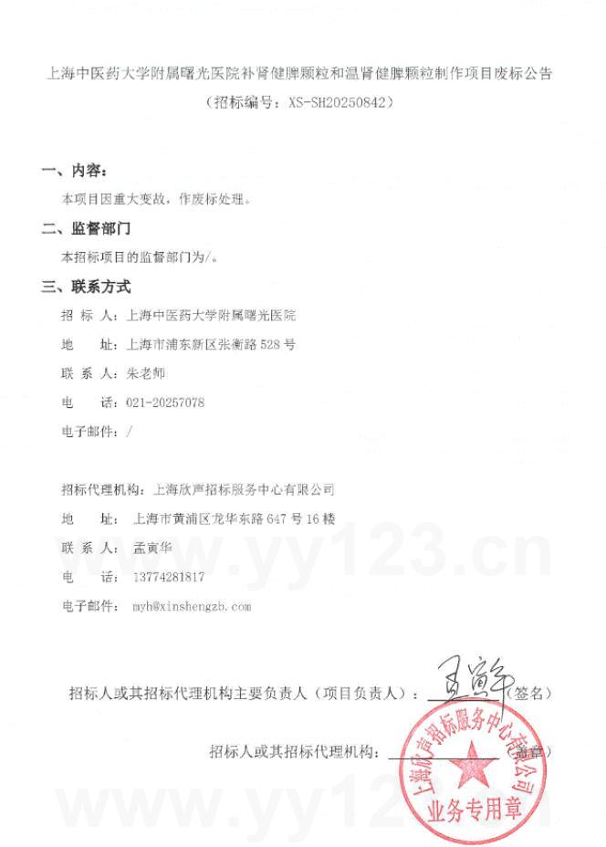 上海中医药大学附属曙光医院补肾健脾颗粒和温肾健脾颗粒制作项目废标公告