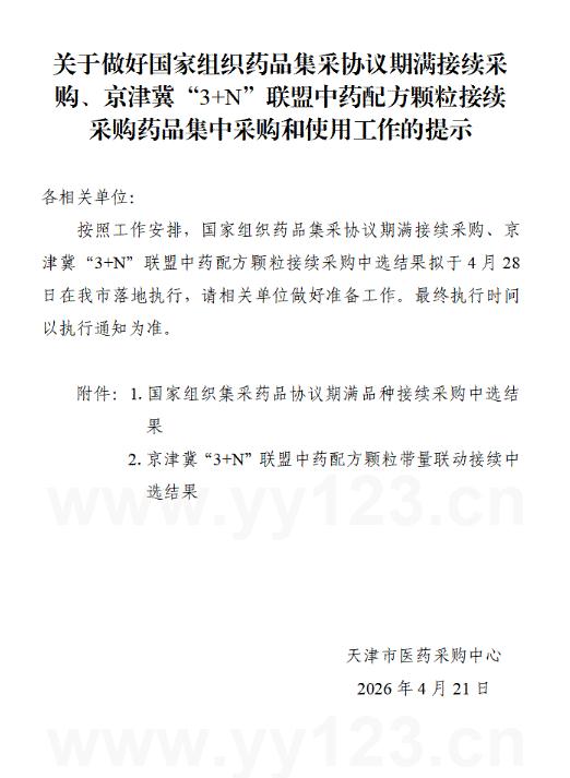 天津市关于做好国家组织药品集采协议期满接续采购、京津冀“3+N”联盟中药配方颗粒接续采购药品集中采购和使用工作的提示